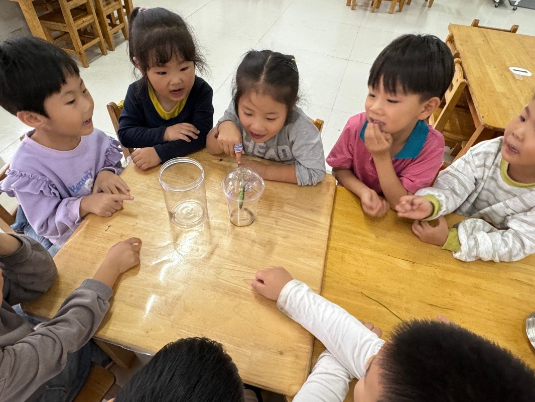 透明的玻璃瓶里,蟋蟀不时弹跳几下,螳螂则安静地趴着。孩子们围在桌边,七嘴八舌地讨论起来:“给它们喂小草好不好?”“我觉得它们可能喜欢树叶!”“我们可以试试把不同的东西放进去,看看它们会选择什么呢......”