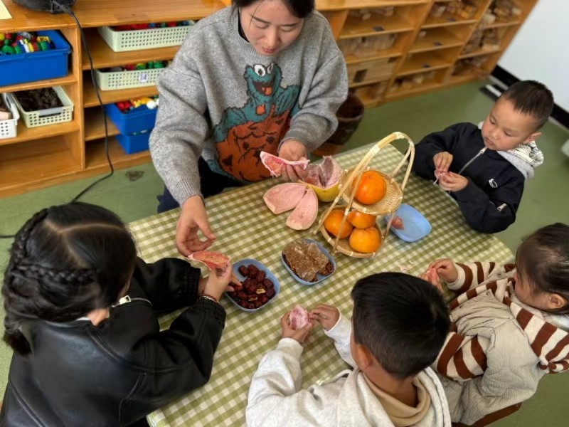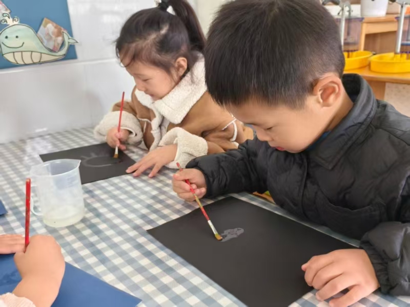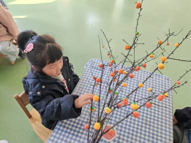 “霜降甜意”食育活动中,孩子们动手洗食材,将红枣、梨块、冰糖依次放进锅里,慢慢熬制。柚子茶制作也不逊色,触摸柚子皮、闻嗅清香,再动手撕剥柚子果肉,果肉、红枣与冰糖一同熬煮。待汤温热后,清甜的口感让大家连连点头。橙色彩泥揉成圆滚滚的“柿子”,错落挂在枝桠间,充满童趣的“霜降柿子树”作品就完成了,满是深秋的鲜活气息。“盐水雪花实验”,杯中倒入清水,再加入食盐搅拌至溶解,孩子们蘸取、绘画,通风晾晒,呈现雪花感受科学的奥秘。