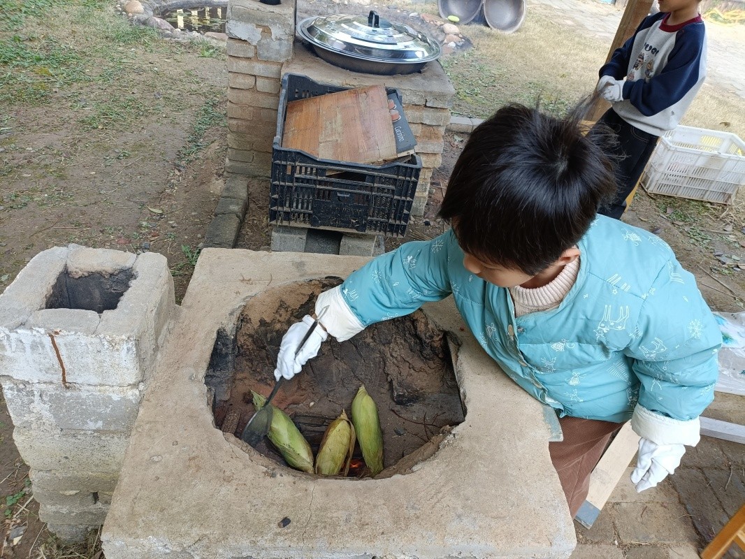 小院里,孩子们围在土灶旁,老师一边讲解,一边教孩子们把红薯洗干净,放进盛满清水的大铁锅里。另一边,几个孩子正小心翼翼地把玉米放在锅底的烤架上。半小时后,土灶的烟气呼呼往上冒,呛得费费直眯眼,小手不住地在脸前扇着,拿起大勺子将大大小小的红薯一个个捞出来,红薯的甜香混着热气更浓了。另一边的孩子戴着白色手套,手持小铲子,专注地翻动土灶里的玉米,调整玉米的位置,让每一根都能均匀受热,不一会儿,玉米外皮开始微微变焦,散发出阵阵香气。