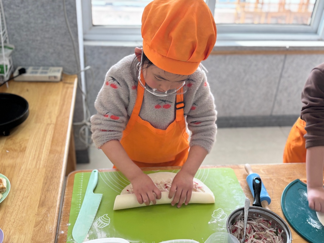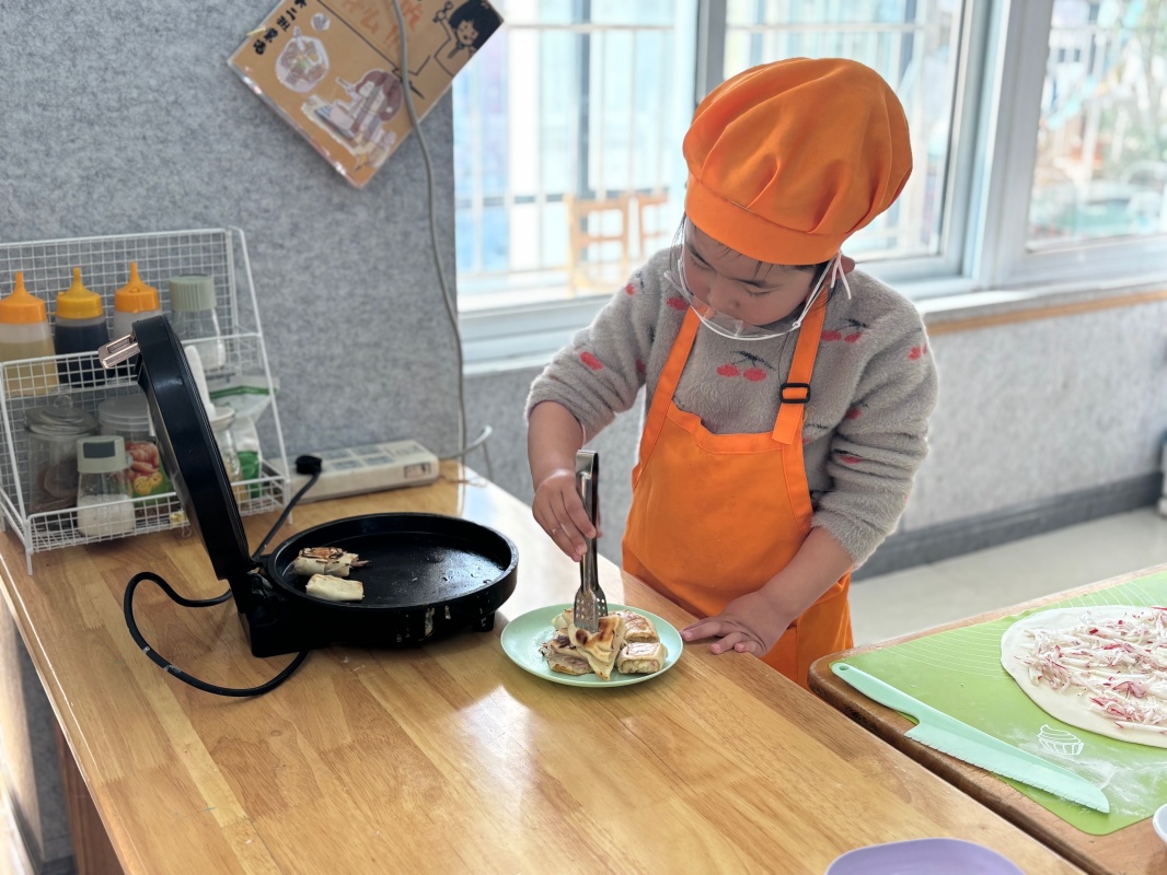 生活区的孩子们化身小小美食家,分工合作,忙得不亦乐乎。“你来揉面擀皮,我来调馅卷馅”,大家各显身手。伊伊认真地揉搓面团,卯足力气擀出圆圆大大的面皮;恩恩踮起脚尖仔细调配萝卜馅料,专注的模样格外可爱;伊伊小心翼翼再将馅料卷入面皮,把长长的萝卜卷切成一个个小块。在老师的协助下,切好的萝卜卷被放入锅中煎制,不一会儿,阵阵香气便弥漫开来。