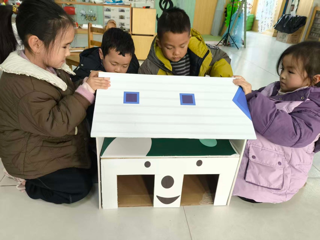 孩子们设计兔舍、寻找材料、制作新家,分工合作,遇到问题自行解决,或寻求老师的帮助,一个上午的努力终于把兔宝宝的家做好啦!并在兔舍里添置了被子,随后送去了兔舍。一只兔宝宝试探着把头伸进门里又出来,前脚爬到二层看了看;另一只也过来把头伸进另一个门里,随后都跑了,孩子们焦急地说:“进去啊!里面暖和哦!”