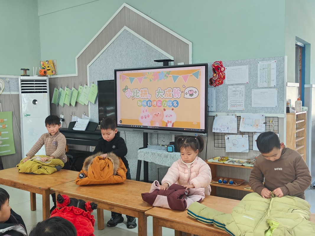 比赛的号角率先吹响!小选手们摩拳擦掌,跃跃欲试,比赛项目轮番上阵,考验着宝贝们的小手灵活性和熟练度。看!小达人们全神贯注,叠衣服拉拉链,叠好的衣服边角分明,摆放得整整齐齐;孩子们化身“整理小管家”,动作更快更稳地将画笔、书本送回各自的“家”;接着穿好袜子与鞋子,仔细检查“正反是否正确”,确认无误后高高举手示意。挺直的小身板,是对“自主自理”的自信回应。