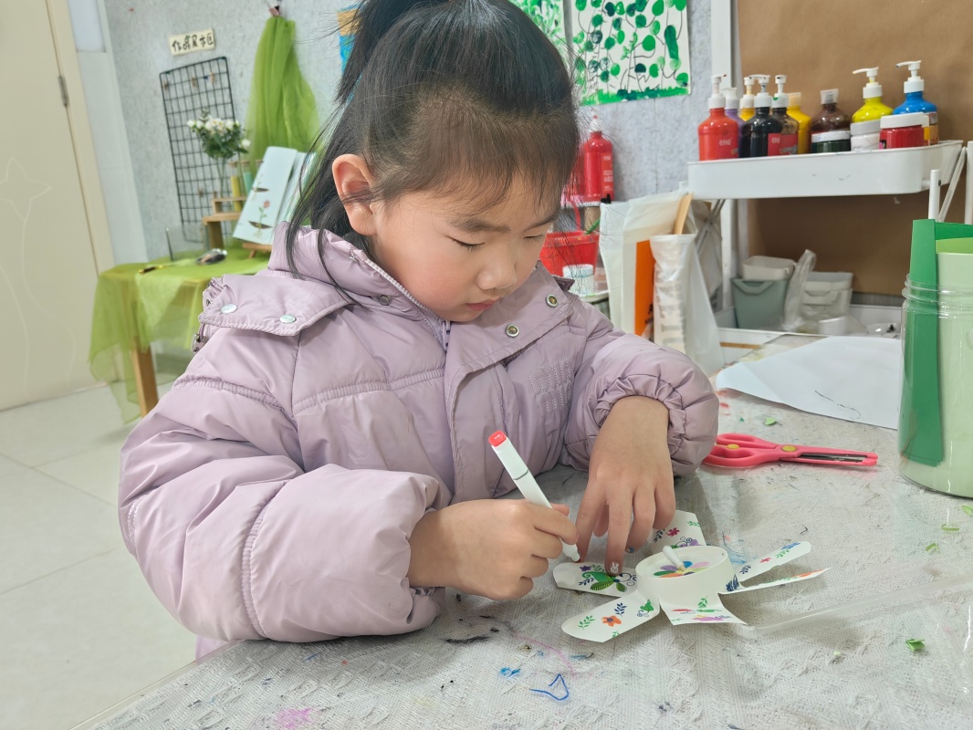 春风拂面,正是感受春风、亲近自然的好时节。老师用绘本故事和趣味图片,带着孩子们一起感受风的方向与力量。小朋友们拿起彩纸、画笔、吸管等材料,尽情发挥创意,画出彩虹、小花、小动物等可爱图案,亲手制作出一只只充满童趣的小风车。